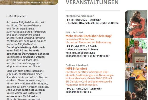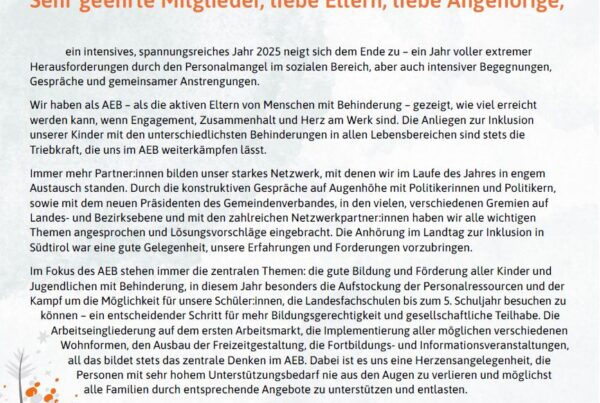 AktuellesAllgemein10 Jahre Teilhabe und Inklusion von Menschen mit Behinderungen in Südtirol – AEB zieht Bilanz und fordert mutige Umsetzung