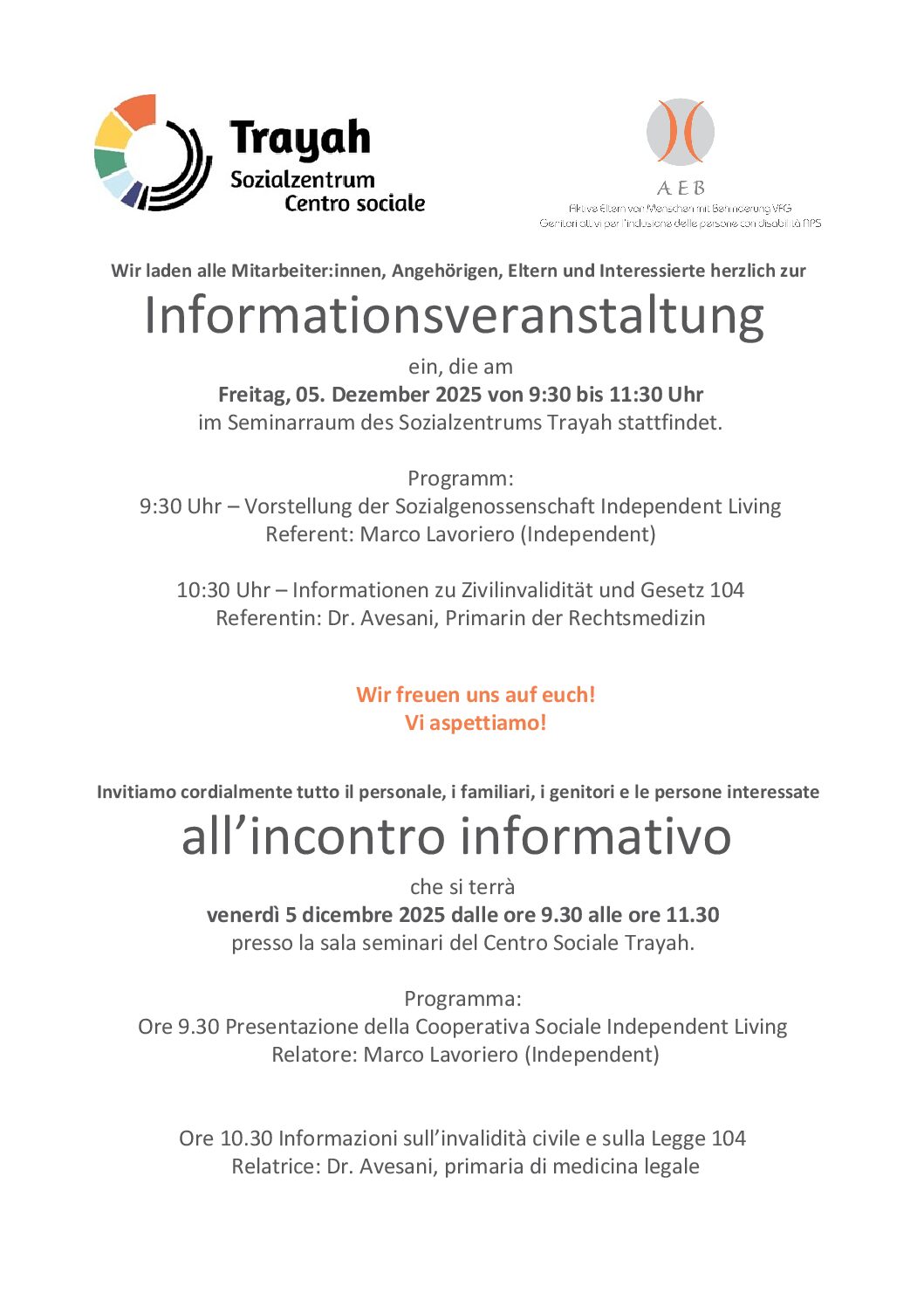 Nov. 07 Love0 Informationsveranstaltung im Sozialzentrum Trayah By a-eb Aktuelles, Allgemein Wir laden alle Mitarbeiter:innen, Angehörigen, Eltern und Interessierte herzlich zur Informationsveranstaltung ein, die am Freitag, 05. Dezember 2025 von 9:30…Mehr