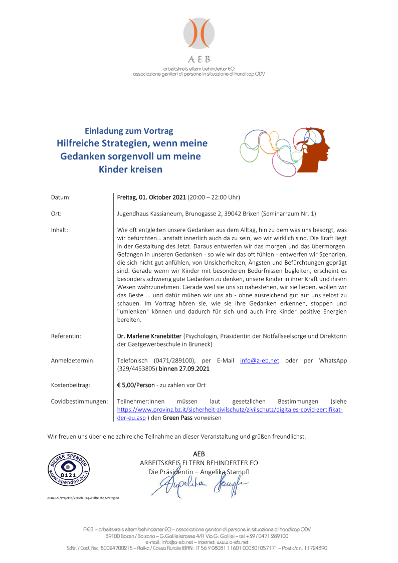 Startseite » Einladung zum Vortrag „Hilfreiche Strategien, wenn meine Gedanken sorgenvoll um meine Kinder kreisen“ am 01. Oktober 2021 im Jugendhaus Kassianeum in Brixen