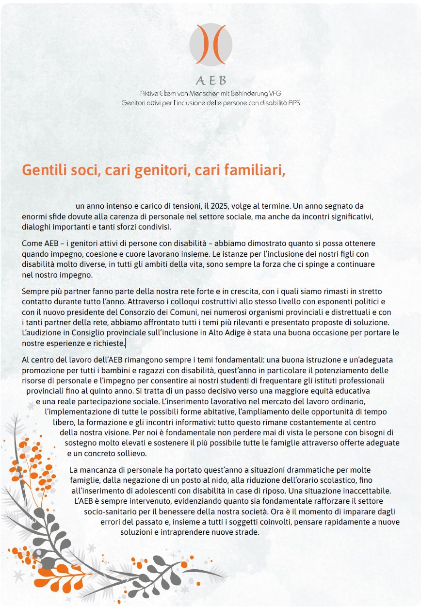 Dic 01 Love0 Lettera natalizia 2025 By a-eb News, Non categorizzato Gentili soci, cari genitori, cari familiari, un anno intenso e carico di tensioni, il 2025, volge al termine. Un anno…Avanti