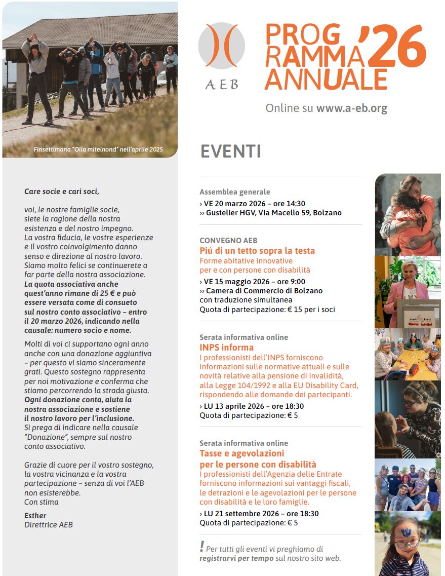 Giu 10 Love0 10 anni di partecipazione e inclusione delle persone con disabilità in Alto Adige – AEB traccia un bilancio e chiede un’attuazione coraggiosa By a-eb News Comunicato stampa AEB :10 anni di partecipazione e inclusione delle persone con disabilità in Alto Adige – AEB traccia un…Avanti