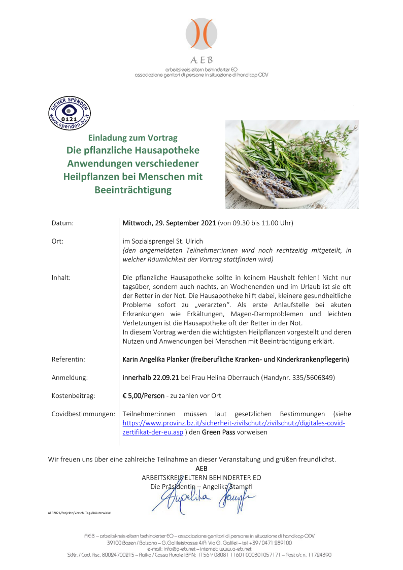 Einladung zum Vortrag “Die pflanzliche Hausapotheke Anwendungen verschiedener Heilpflanzen bei Menschen mit Beeinträchtigung” am 29. September 2021 im Sozialsprengel in St. Ulrich