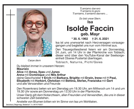 La ns. cara Isolde Mayr Faccin, membro del ns. consiglio direttivo che si è impegnata attivamente per le cause comuni ci ha lasciato troppo presto.