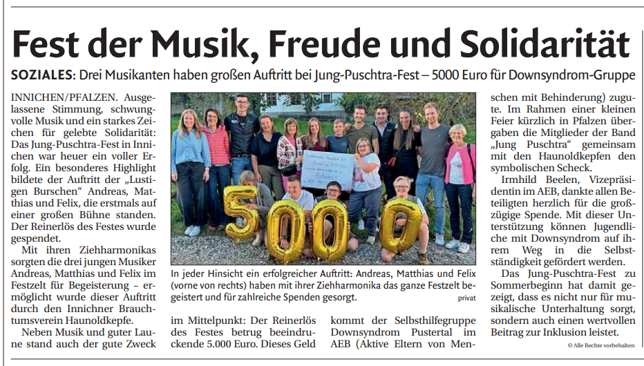 Jung Puschtra Fest in Innichen: Musik, Freude und 5.000 Euro für Inklusion